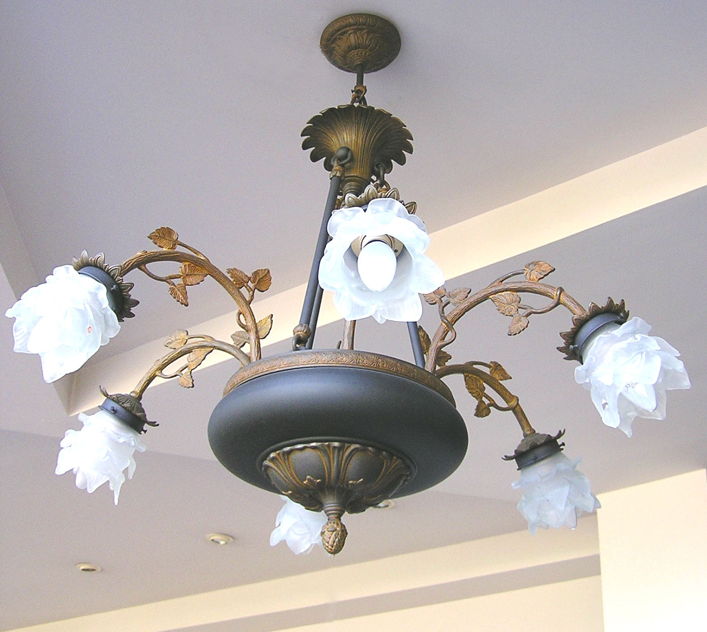 Κρεμαστό φωτιστικό οροφής διχρωμο ( μαυρο και ομπρα ) με μεταλλικο σκελετό και διακοσμηση λουλούδια απο κρύσταλλο οπαλίνα.