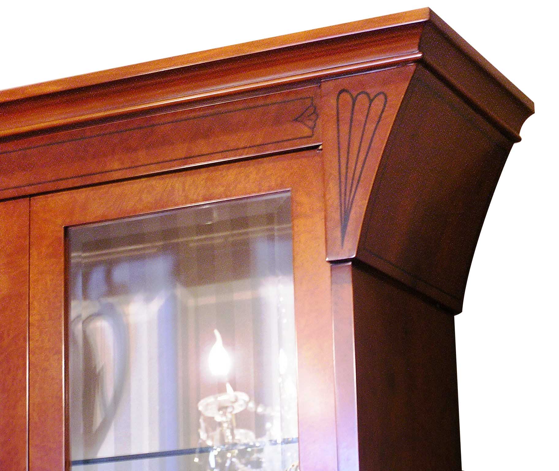 διακοσμητικά χειροποίητα μαρκετερί και σκαλιστές λουκιές στη στέψη, τα συρτάρια και τις πόρτες